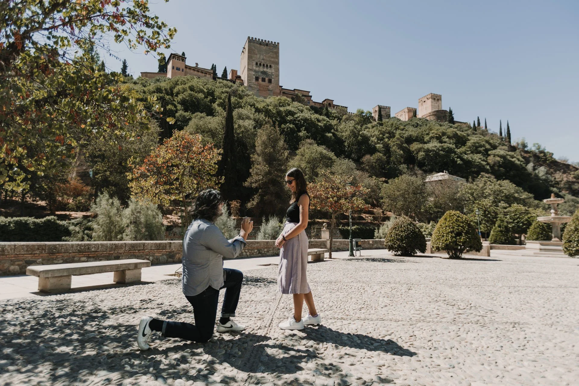 *Since Alex (Photographer Granada) and Daniel had never met in person, here was their clever plan: Meet at Paseo de Los Tristes at 1pm. Alex would be tying his shoe by the fountain and that’s how Daniel would know it was him. Daniel would take a selfie with me and that’s how Alex would know it was us. Daniel would ask “someone” (Alex) to take our photo, to which Alex would pretend to take our photo with Daniel’s phone and then give Daniel a thumbs up, which actually meant it was time to propose. Alex would then slip Daniel’s phone in his pocket and quickly transition to capturing the proposal on his professional camera.